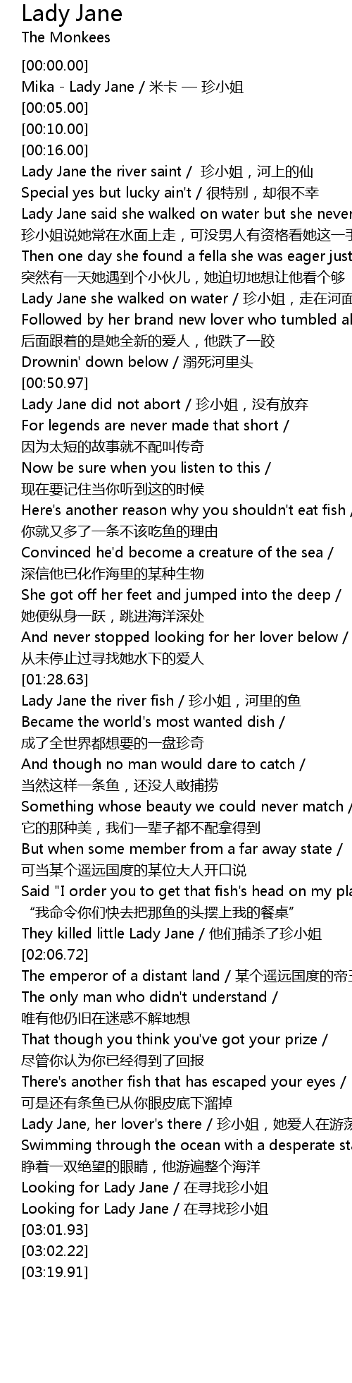 | [01:31.53] | Lady Jane the river fish zhēn xiǎo jiě, hé lǐ de yú |