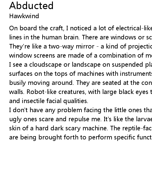 On board the craft, I noticed a lot of electrical-like ceiling lines, like the lines in the human brain. There are windows or screen areas all around the ship. They're like a two-way mirror - a kind of projection place. It is as if these window screens are made of a combination of metal, crystal, or mirrored glass. |