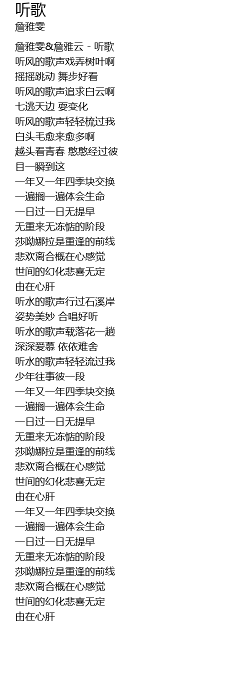 | [00:04.54] | 詹雅雯&詹雅云 - 听歌 |