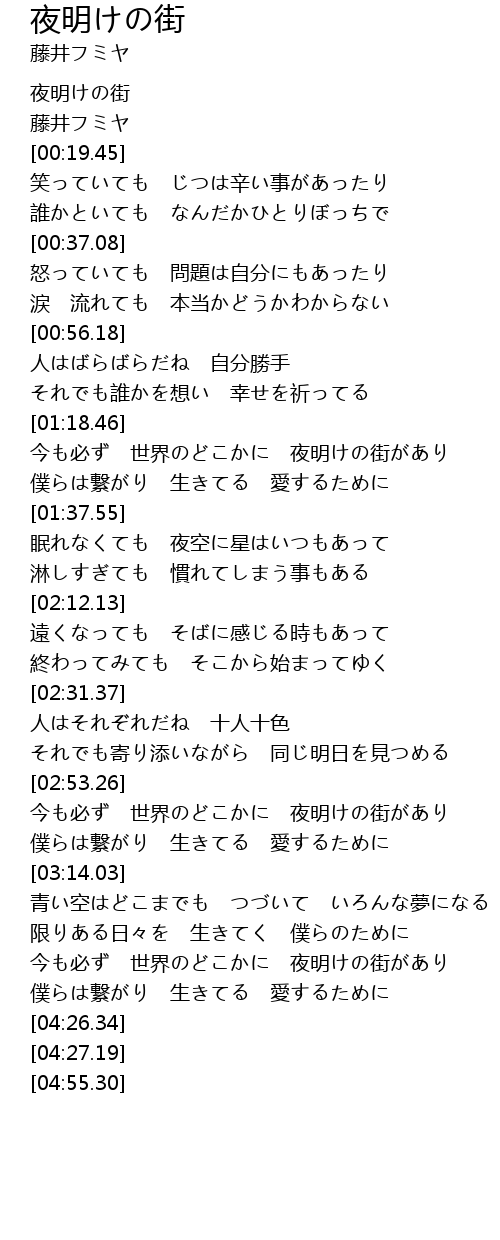 | [01:18.94] | 今も必ず 世界のどこかに 夜明けの街があり |