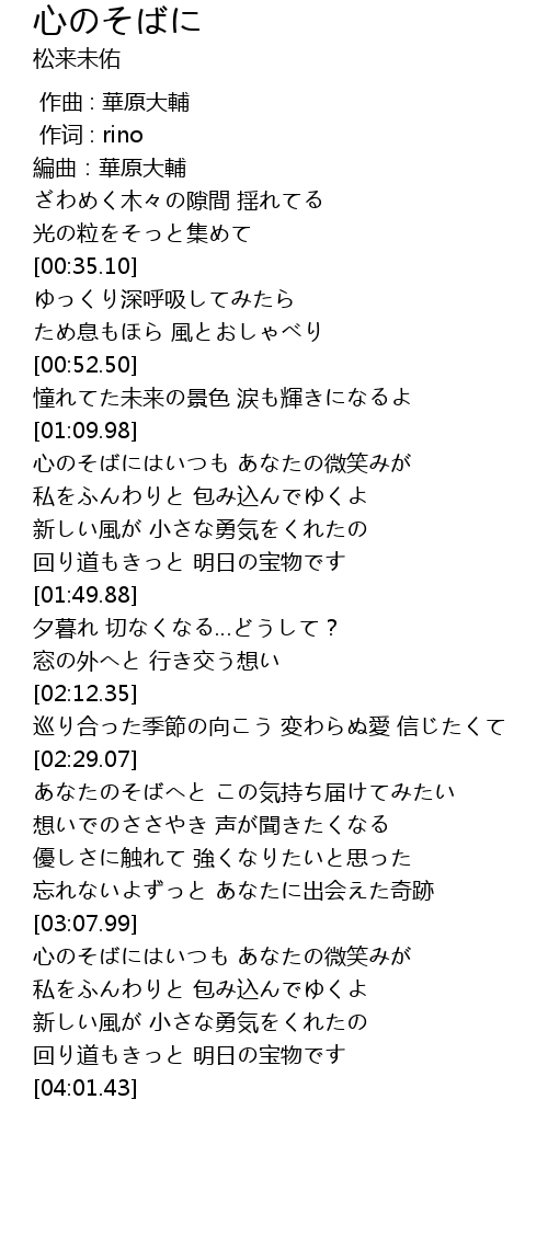 | [03:22.60] | 心のそばにはいつも あなたの微笑みが |
