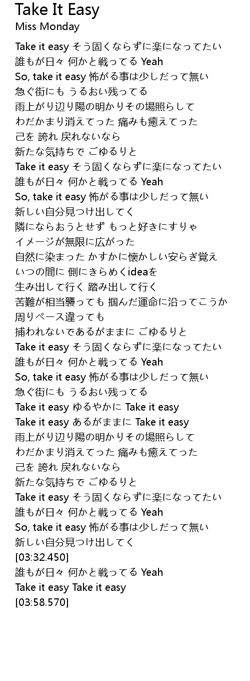 | [02:28.650] | Take it easy ゆるやかに Take it easy |