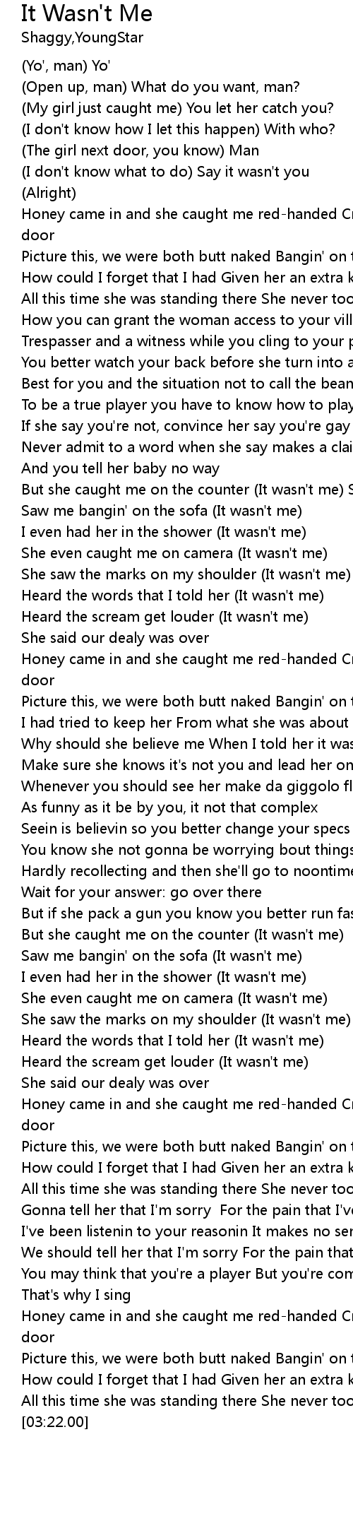 | [01:01.00] | But she caught me on the counter (It wasn't me) Shaggy |