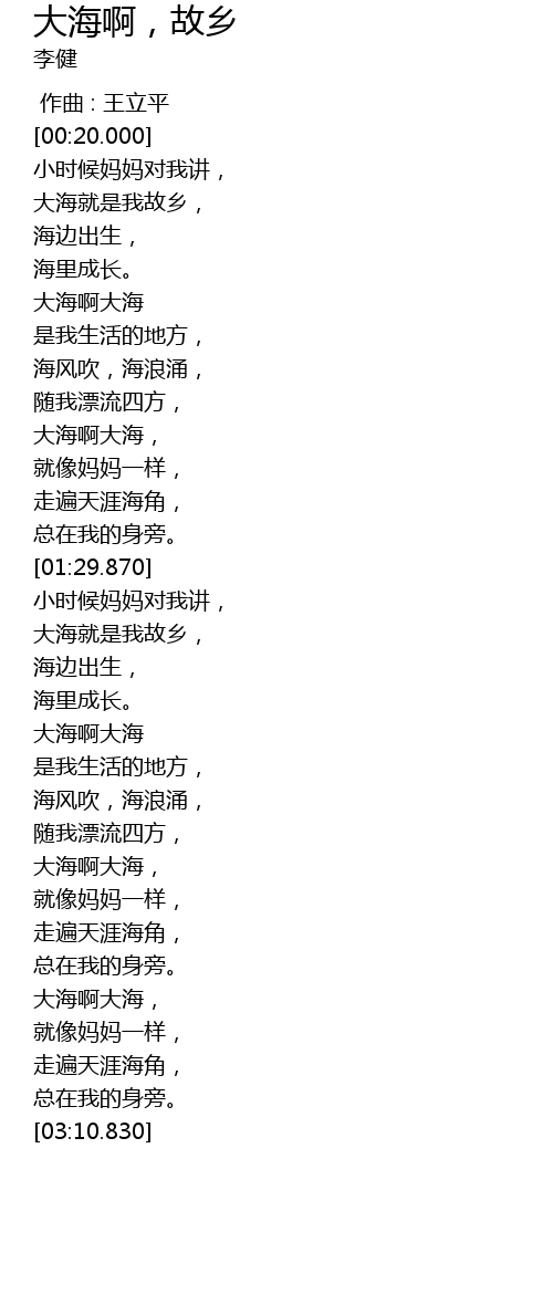 | [01:59.390] | 大海就是我故乡, |