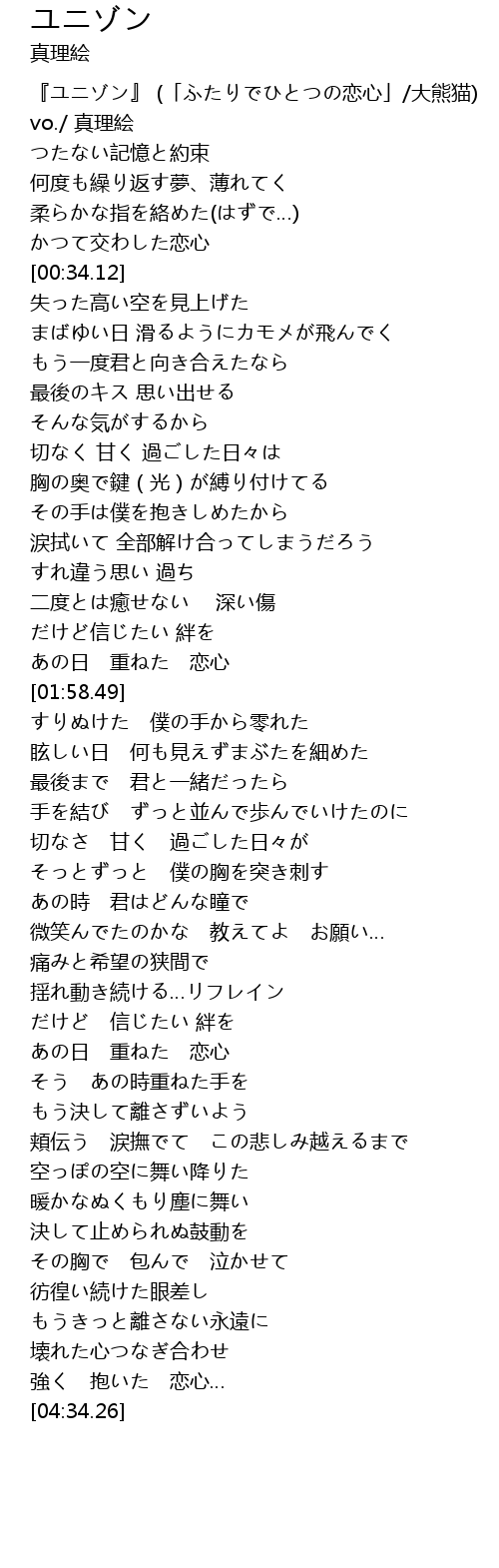 | [00:00.00] | 『ユニゾン』 (「ふたりでひとつの恋心」/大熊猫) |