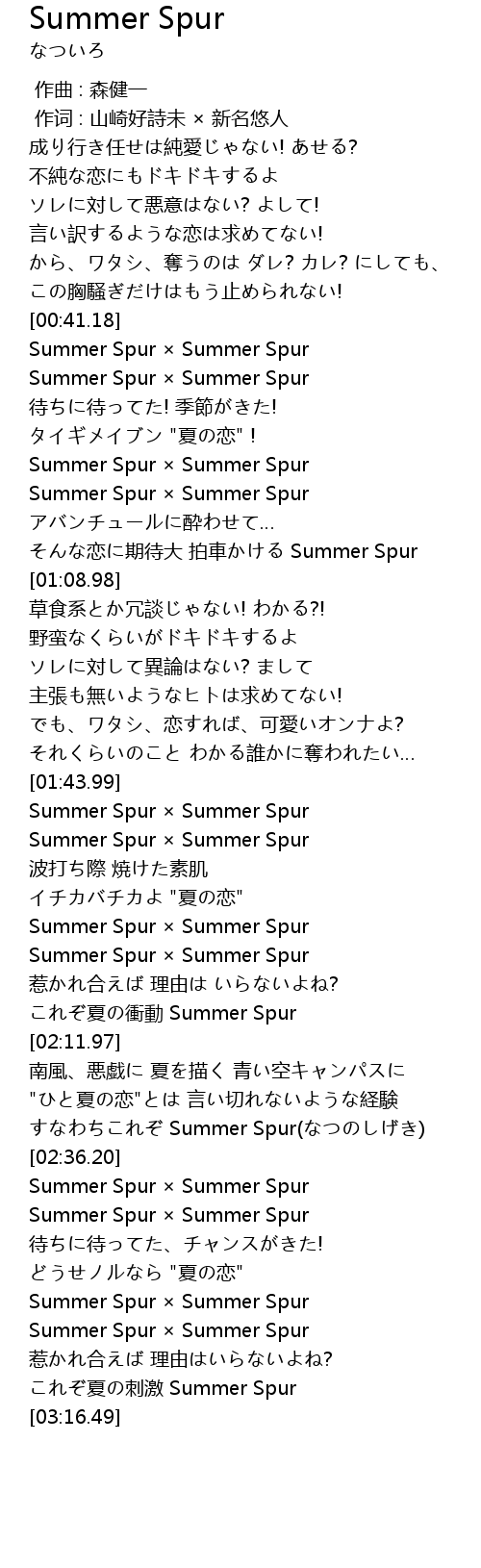 | [02:32.93] | すなわちこれぞ Summer Spur(なつのしげき) |