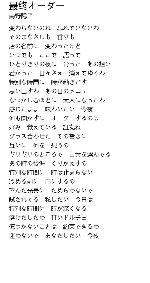 | [01:14.42] | 思い出すわ あの日のメニュー |