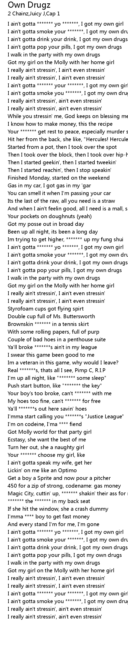 | [02:00.30] | I ain't gotta ******* yo *******, I got my own girl |