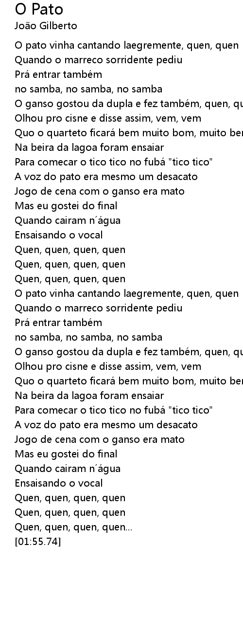 | [00:52.54] | O pato vinha cantando laegremente, quen, quen |