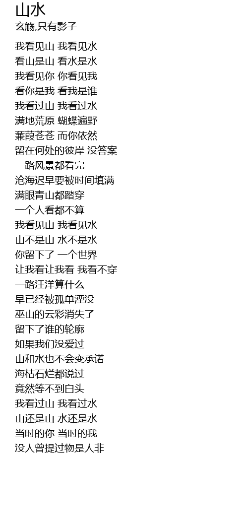 | [00:14.47] | wǒ kàn jiàn shān wǒ kàn jiàn shuǐ |