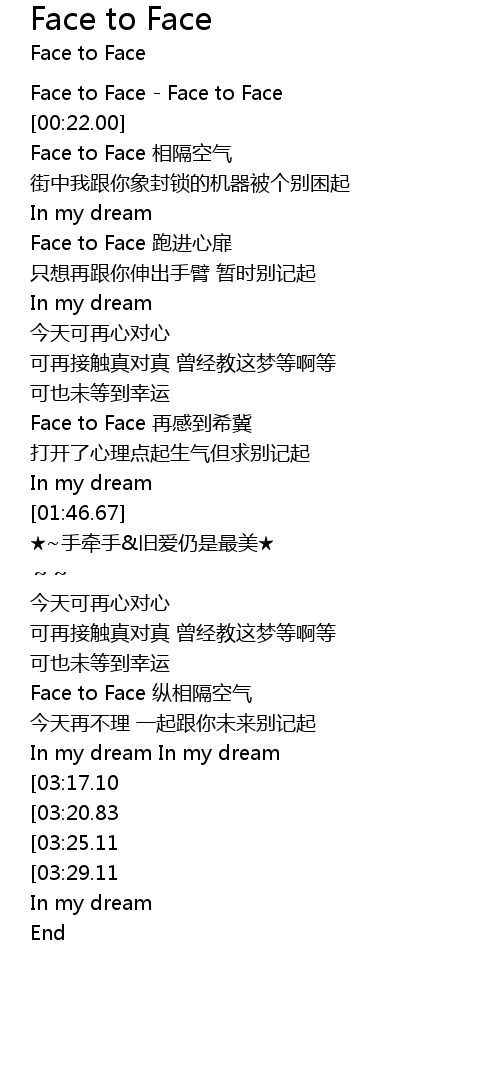 | [03:33.75][03:17.10][02:59.69] | Face to Face 再跑进心扉 |
