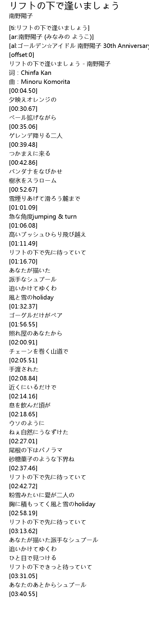 | [00:00.07] | リフトの下で逢いましょう - 南野陽子 |