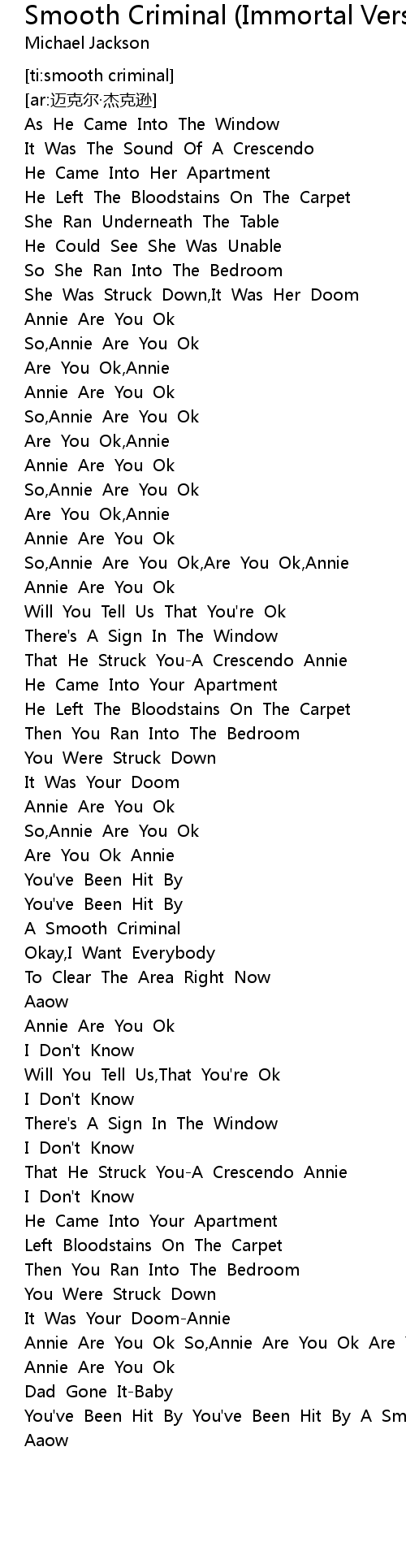 | [01:50.48] | You've Been Hit By You've Been Hit By A Smooth Criminal |