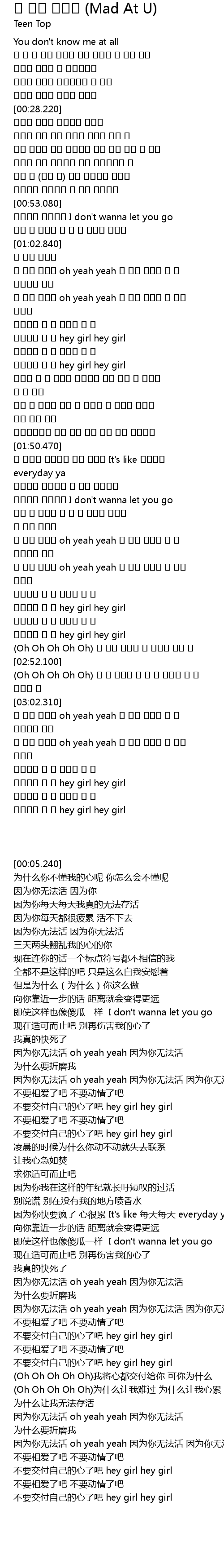 | [02:53.340] | (Oh Oh Oh Oh Oh) 왜 날 아프게 해 왜 날 힘들게 왜 날 못살게 해 |