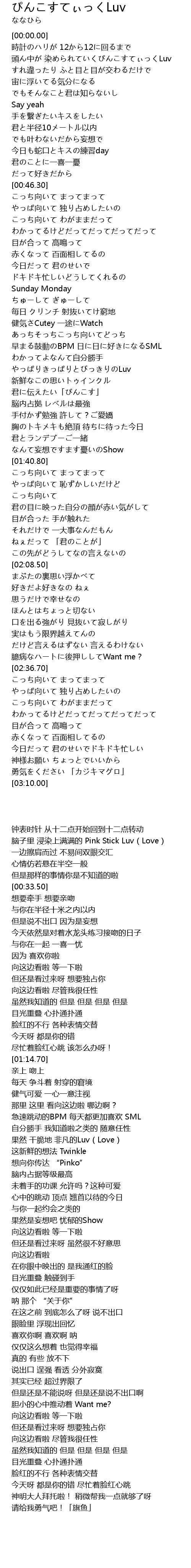 | [00:13.60] | 頭ん中が 染められていくぴんこすてぃっくLuv |