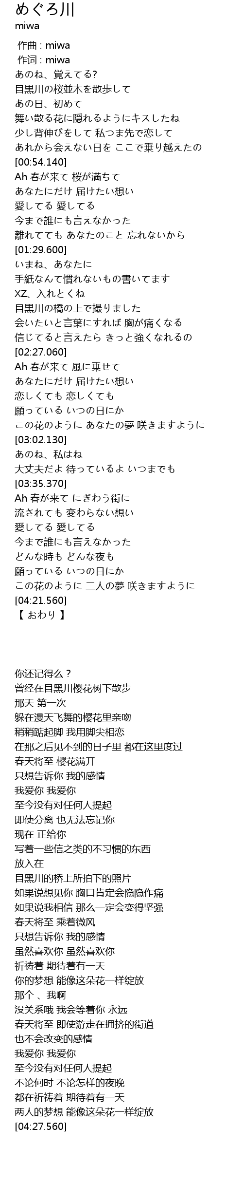 | [01:58.440] | 目黒川の橋の上で撮りました |