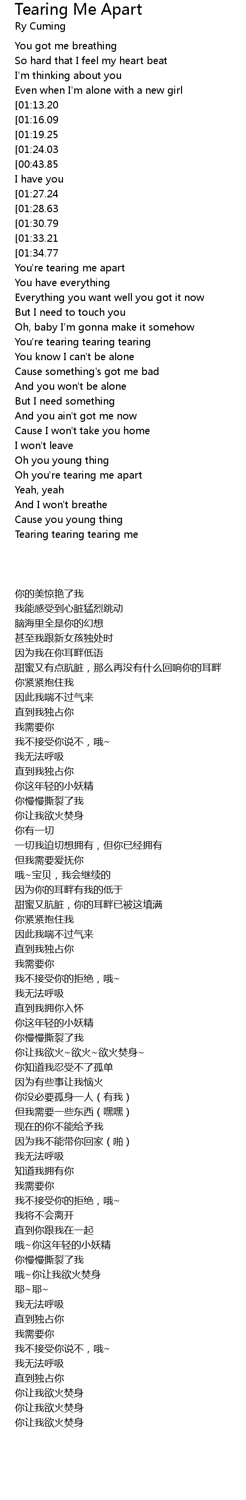 | [00:46.82][01:34.77][02:28.61][02:52.67] | Cause you're tearing me apart |