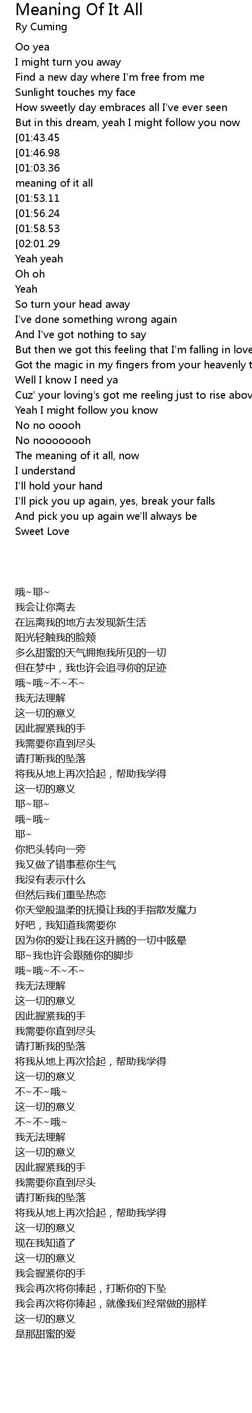 | [00:47.55][01:03.36][01:50.84][02:06.68][02:17.32][02:32.95][02:54.12][03:10.22] | The meaning of it all |