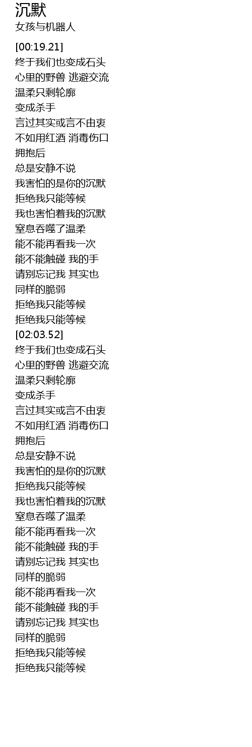 | [03:00.02] | 我害怕的是你的沉默 |