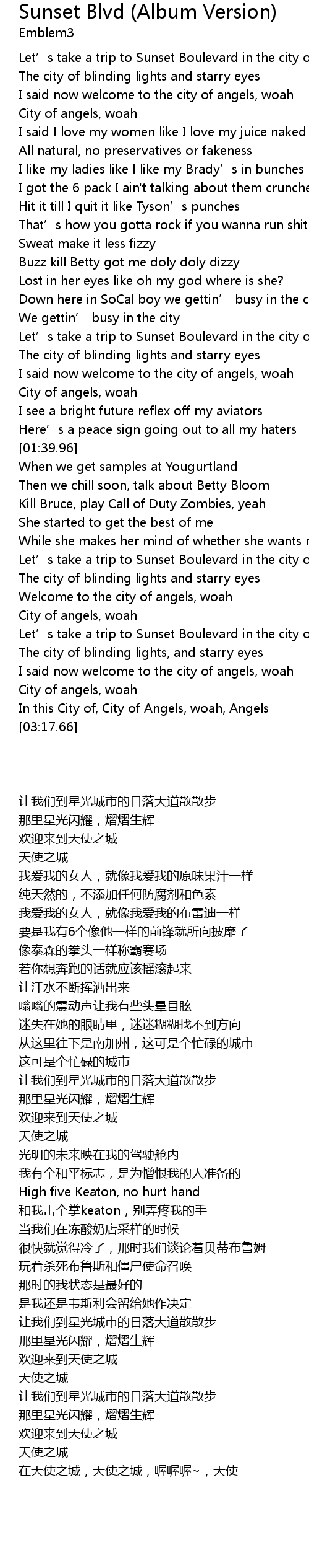 | [01:56.36] | Let' s take a trip to Sunset Boulevard in the city of stars |