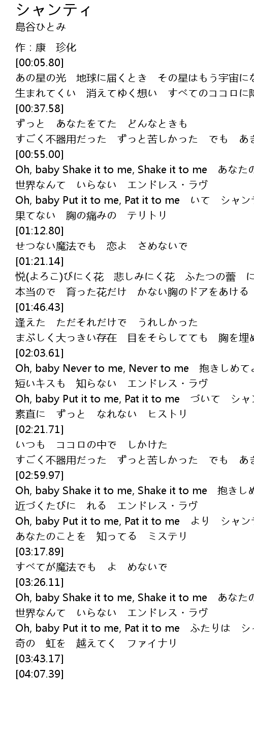 | [02:13.39] | Oh, baby Put it to me, Pat it to me づいて シャンティ |