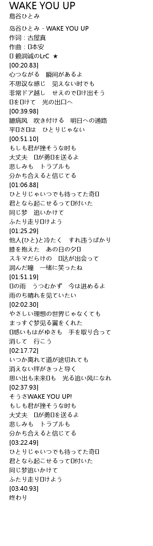| [00:01.83] | 岛谷ひとみ - WAKE YOU UP |