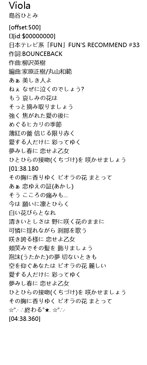 | [03:16.610] | 空を仰ぐあなたは ビオラの花 麗しい |