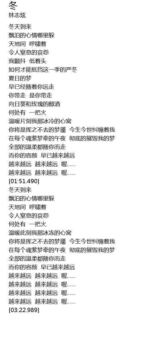 | [03:06.219] | 越来越远 越来越远 喔…… |