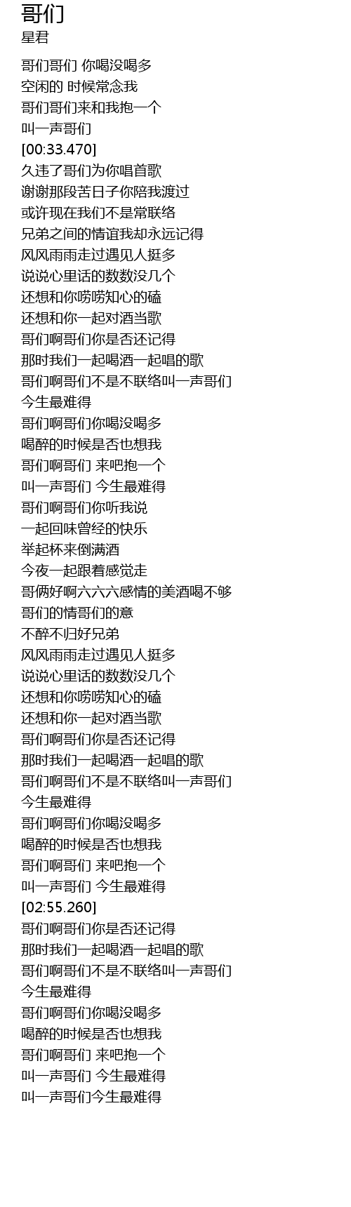 | [03:05.650] | 哥们啊哥们不是不联络叫一声哥们 |