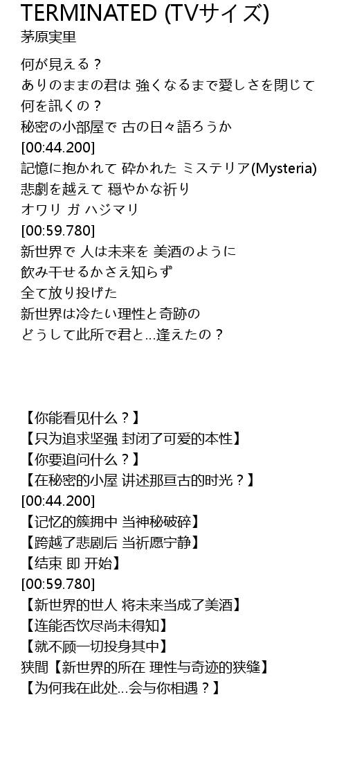 | [00:45.040] | 記憶に抱かれて 砕かれた ミステリア(Mysteria) |