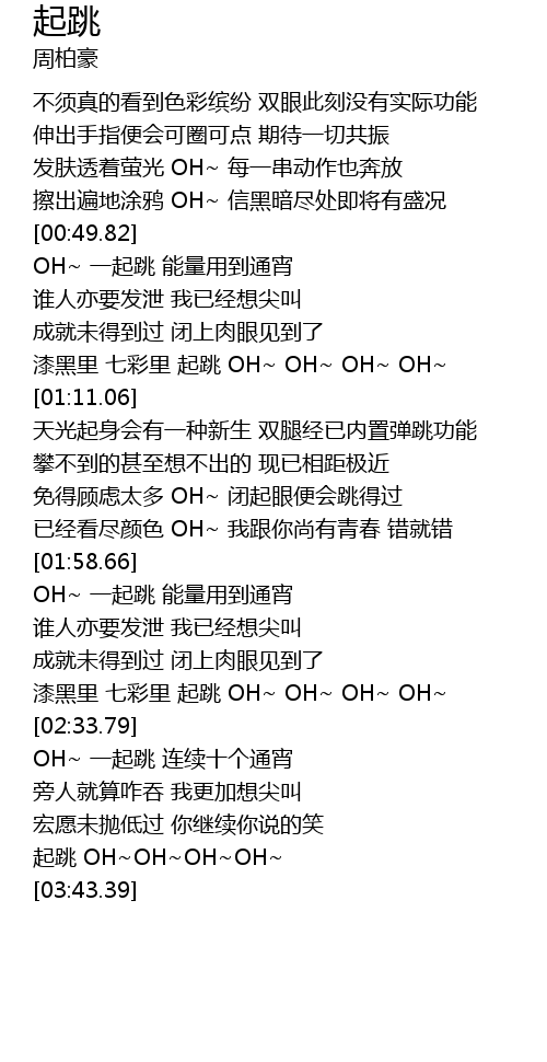 | [01:03.73] | qī hēi lǐ qī cǎi lǐ qǐ tiào OH OH OH OH |