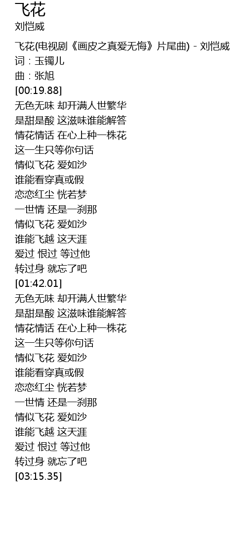 | [00:02.62] | 飞花(电视剧《画皮之真爱无悔》片尾曲) - 刘恺威 |