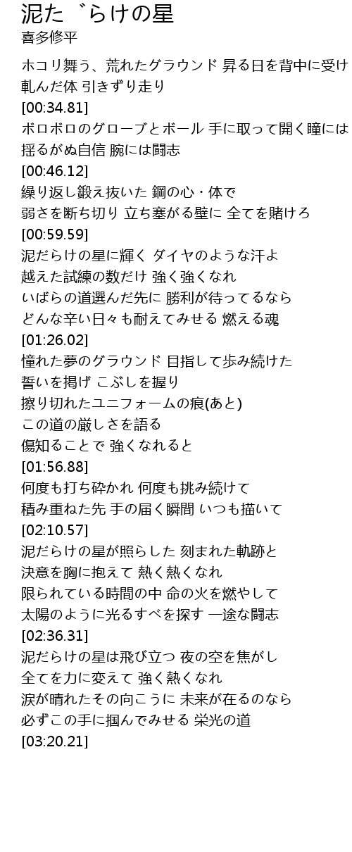 | [01:45.78] | 擦り切れたユニフォームの痕(あと) この道の厳しさを語る |