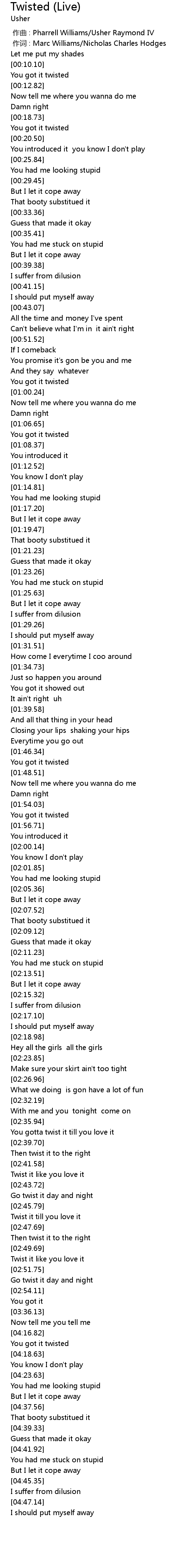 | [00:00.00] | 作曲 : Pharrell Williams/Usher Raymond IV |