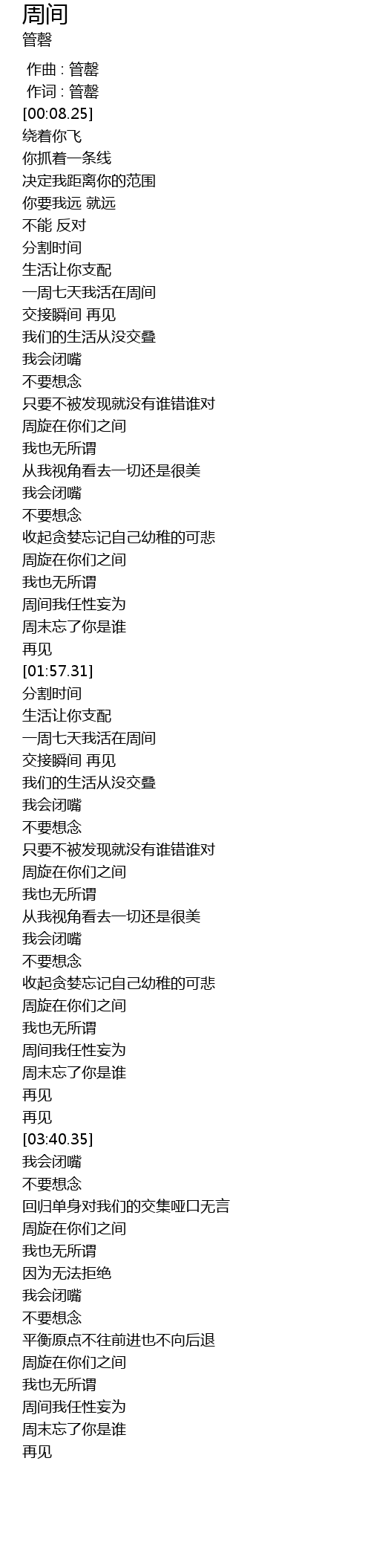 | [04:34.55] | zhōu mò wàng le nǐ shì shuí |