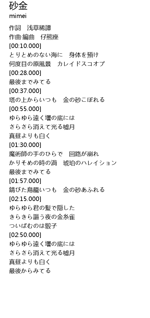 | [01:58.750] | 錆びた鳥籠いつも 金の砂あふれる |