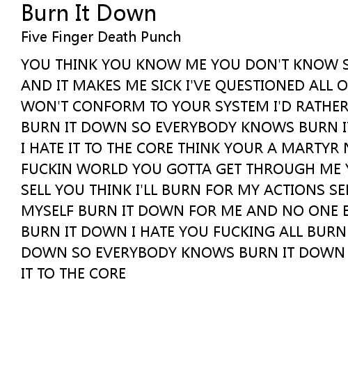YOU THINK YOU KNOW ME YOU DON'T KNOW SHIT I'VE SEEN THE WORLD THROUGH YOUR EYES AND IT MAKES ME SICK I'VE QUESTIONED ALL OF YOU ANWSERS THE'RE FUCKIN LIES I WON'T CONFORM TO YOUR SYSTEM I'D RATHER DIE BURN IT DOWN JUST TO WATCH IT GO BURN IT DOWN SO EVERYBODY KNOWS BURN IT DOWN JUST TO SEE IT TORCHED BURN IT DOWN I HATE IT TO THE CORE THINK YOUR A MARTYR NOT HARD TO SEE YOU WANNA RULE THE FUCKIN WORLD YOU GOTTA GET THROUGH ME YOUR IRON FIST WILL BE BROKEN NO SOUL TO SELL YOU THINK I'LL BURN FOR MY ACTIONS SEE YOU IN HELL BURN IT DOWN I DO IT FOR MYSELF BURN IT DOWN FOR ME AND NO ONE ELSE BURN IT DOWN JUST TO WATCH IT FALL BURN IT DOWN I HATE YOU FUCKING ALL BURN IT DOWN JUST TO WATCH IT GO BURN IT DOWN SO EVERYBODY KNOWS BURN IT DOWN JUST TO SEE IT TORCHED BURN IT DOWN I HATE IT TO THE CORE |