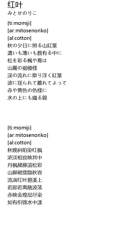 | [00:13.42] | 秋の夕日に照る山紅葉 |