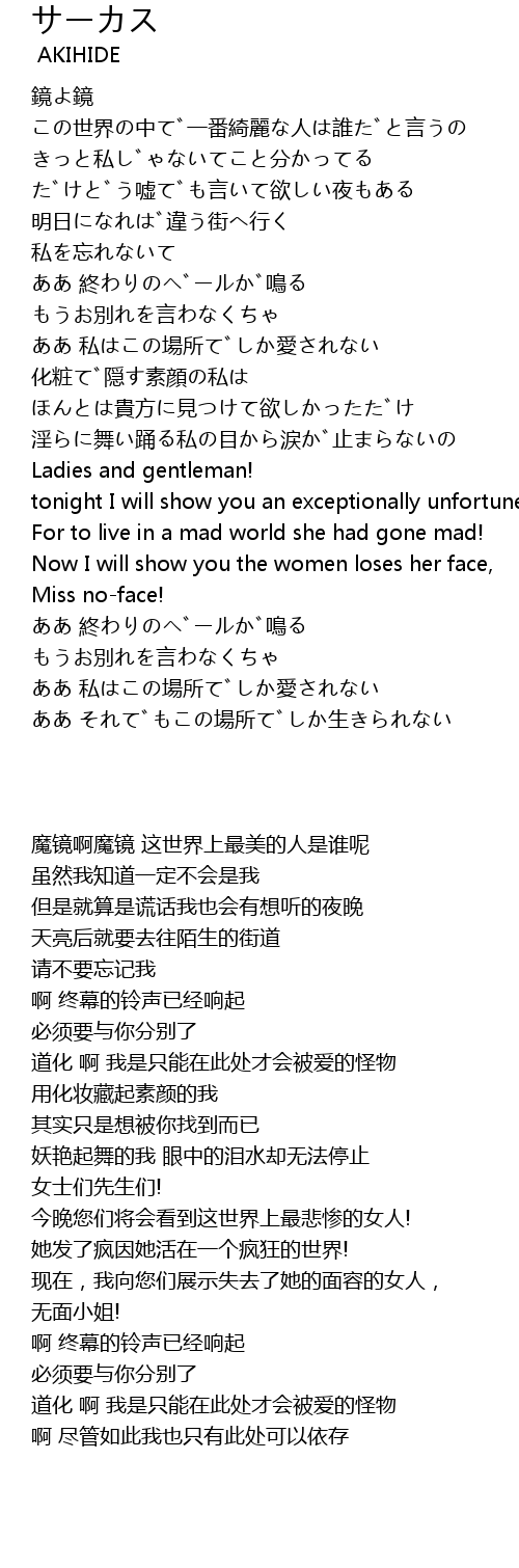 | [00:38.556] | 鏡よ鏡 この世界の中で一番綺麗な人は誰だと言うの |