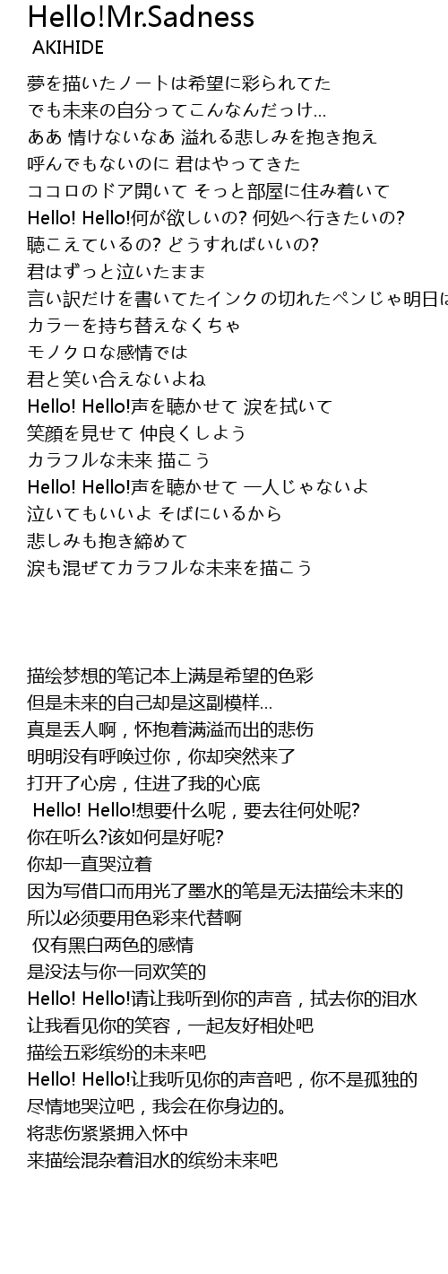 | [01:53.40] | Hello! Hello!声を聴かせて 涙を拭いて |