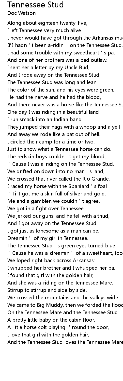 | 'Cause I was a-riding on the Tennessee Stud. | |