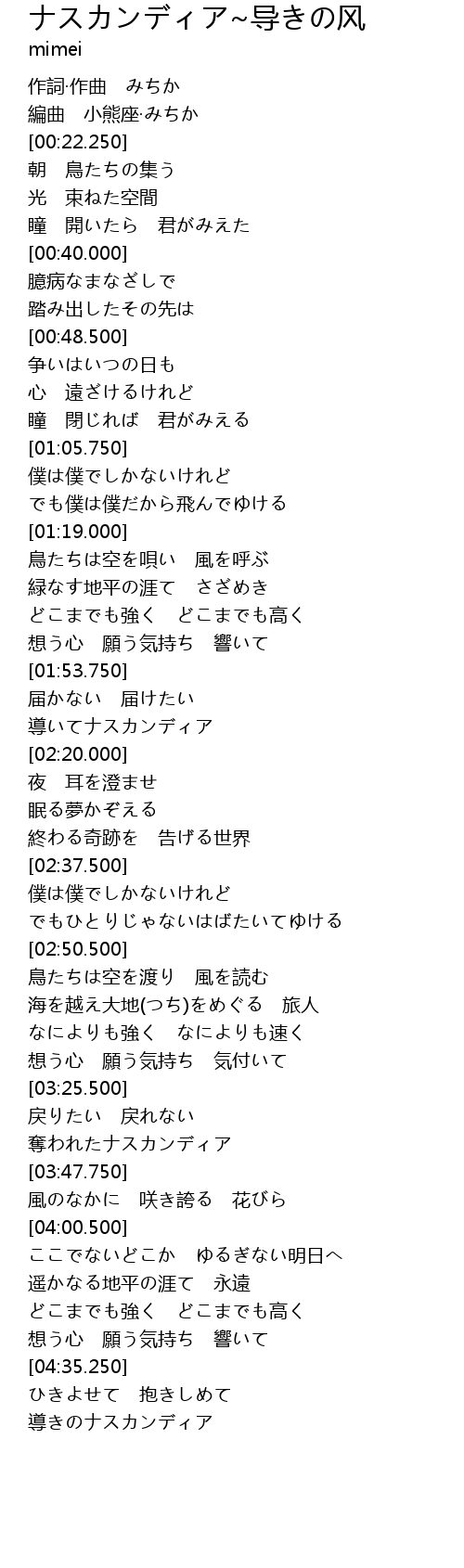 | [01:19.250] | 鳥たちは空を唄い 風を呼ぶ |