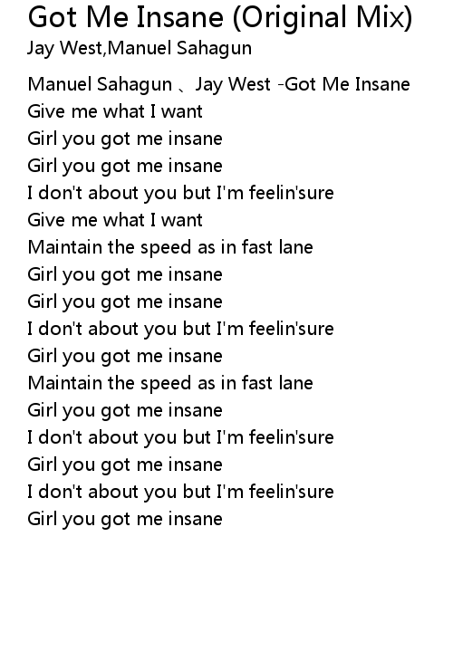 | [00:00.93] | Manuel Sahagun Jay West Got Me Insane |