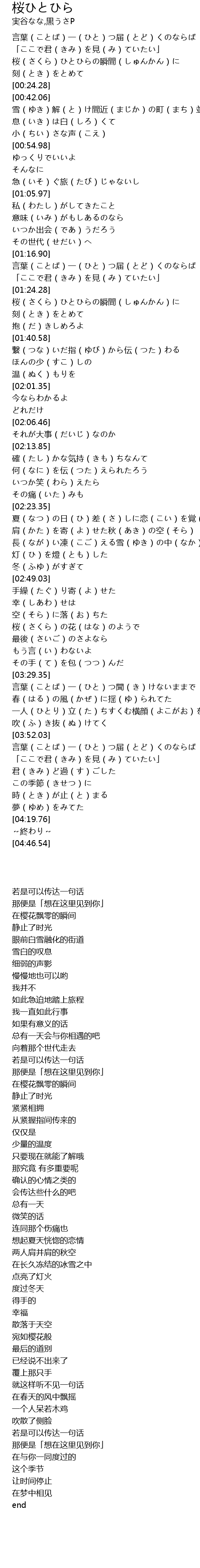 | [00:12.01] | 桜(さくら)ひとひらの瞬間(しゅんかん)に |