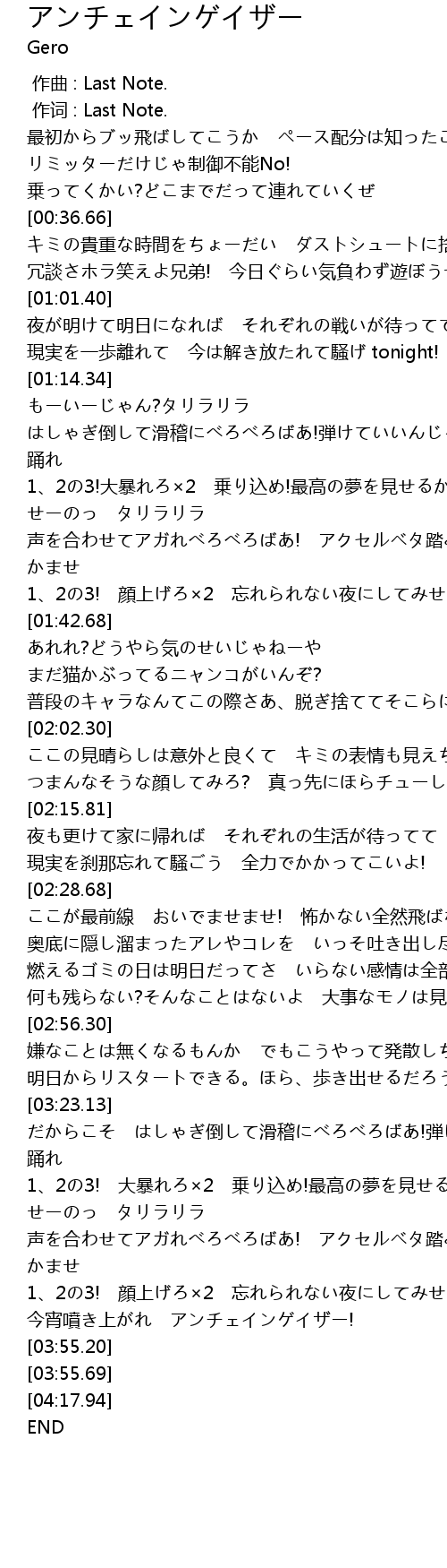 | [03:49.93] | 今宵噴き上がれ アンチェインゲイザー! |