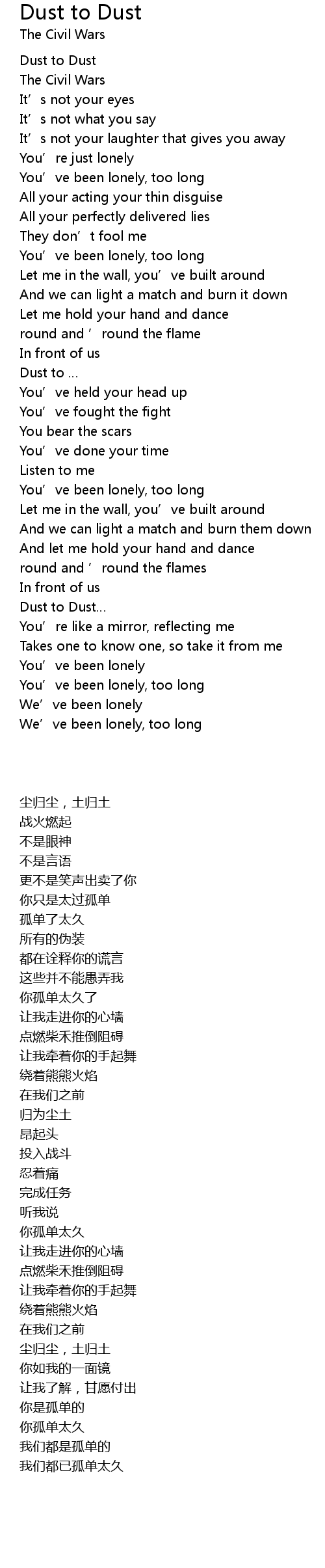| [00:06.160] | Dust to Dust |