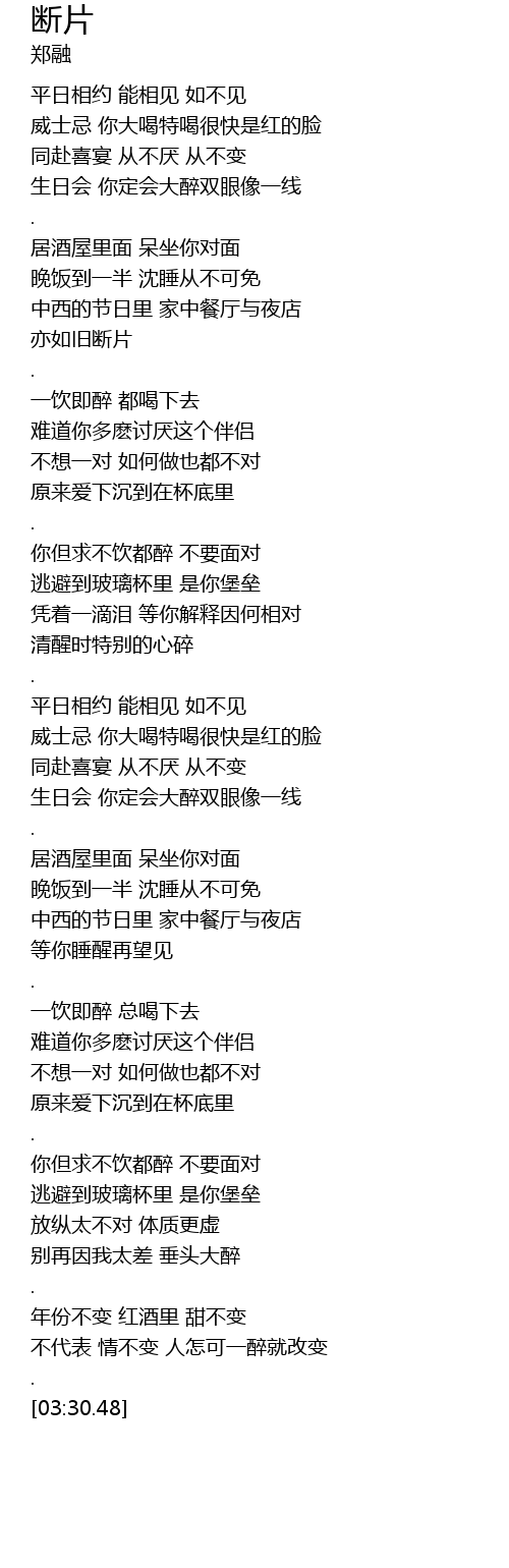 | [01:55.04] | 威士忌 你大喝特喝很快是红的脸 |