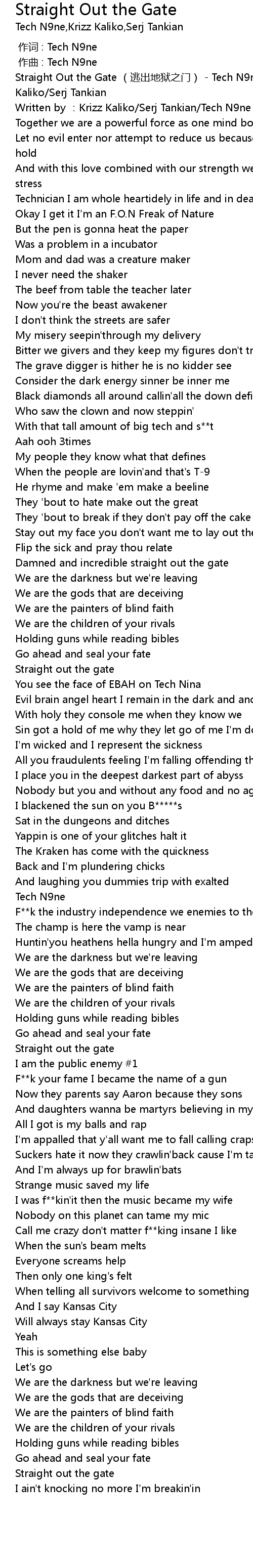 | [00:00.32] | Straight Out the Gate táo chū dì yù zhī mén Tech N9ne Krizz Kaliko Serj Tankian |