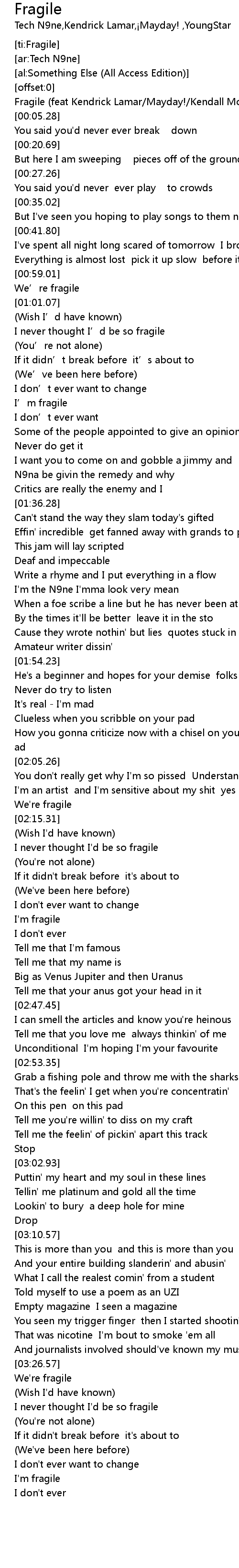 | [00:00.84] | Fragile feat Kendrick Lamar Mayday! Kendall Morgan Tech N9ne |