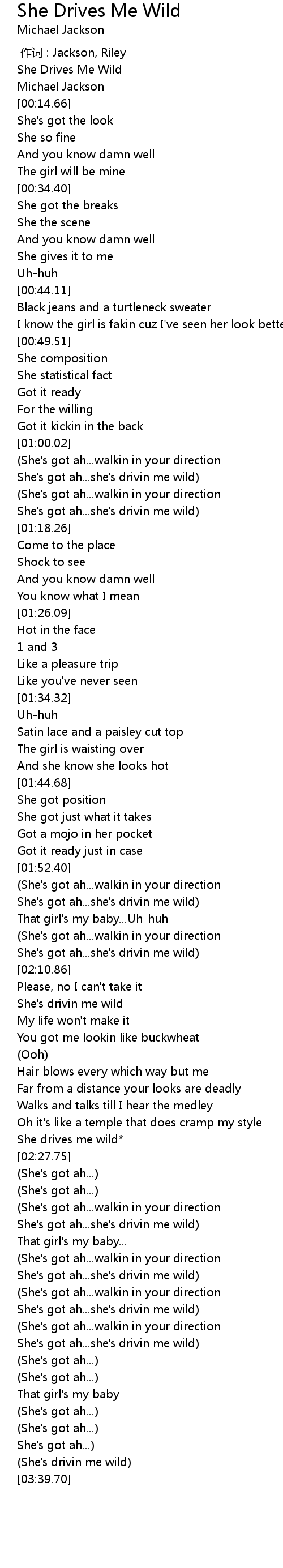 | [03:00.77] | She's got ah...she's drivin me wild) |